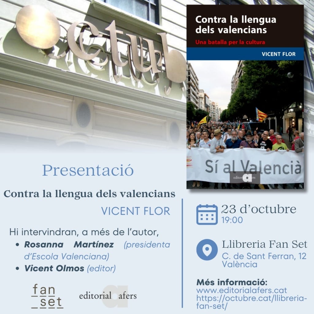 L’editorial Afers publica el nou llibre del sociòleg Vicent Flor, Contra la llengua dels valencians. Una batalla per la cultura, un assaig que indaga en el paper de la llengua com a instrument de poder i en la persistència del conflicte lingüístic al País Valencià. El volum es presentarà aquest dijous, 23 d’octubre, a les 19 h, a la llibreria Fan Set de València. En l’acte, hi intervindran, a més de l’autor, la presidenta d’Escola Valenciana, Rosanna Martínez, i l’editor de l’obra, Vicent Olmos.