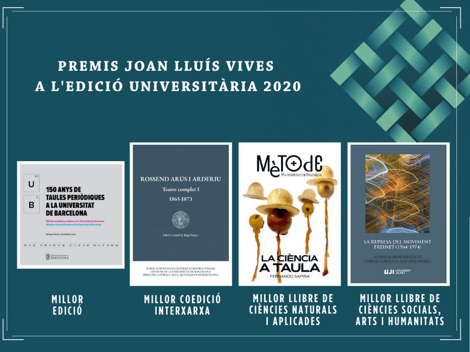 - Millor llibre de ciències socials, arts i humanitats: La represa del moviment Freinet (1964-1974), a cura d’Alfred Ramos González i Ferran Zurriaga Agustí, i publicat pel Servei de Comunicació i Publicacions de la Universitat Jaume I. L’obra reescriu la història del moviment Freinet i la seua lluita per una escola alternativa. Es tracta de la crònica de la resistència d’aquest moviment de renovació docent per portar a la pràctica les seues idees pedagògiques i de canvi social, així com la defensa de la dignitat de la infància, i la coherència radical de l’ofici de mestre.