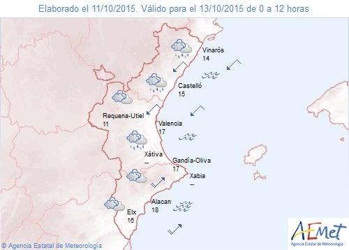 El litoral de valència i el litoral nord del les comarques del Sud estan aquest dimarts en alerta per probables ruixats que poden ser localment forts i que ocasionalment poden anar acompanyats de tempesta, segons la predicció d’Aemet.