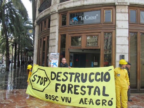 Un grup d’activistes d’Acció Ecologista-Agró i de la Plataforma Bosc Viu han desplegat hui, dijous 13 de març, una pancarta davant de les oficines centrals de La Caixa a València per a cridar l’atenció sobre les greus actuacions efectuades per la Conselleria de Medi Ambient amb finançament d’aquesta entitat bancària. Els ecologistes han mostrat imatges de les actuacions i han repartit informació als vianants per a donar a conéixer la gravetat de les actuacions que, paradoxalment, es presenten i es publiciten com a beneficioses per al medi ambient.