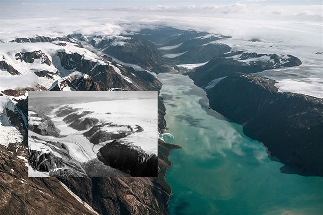 En l’estiu de 2013 (fotografia gran), la glacera havia retrocedit uns 3 quilòmetres des de l’estiu de 1935 (fotografia inserida), segons l’investigador Anders Bjork, del Museu d’Història Natural de Dinamarca.