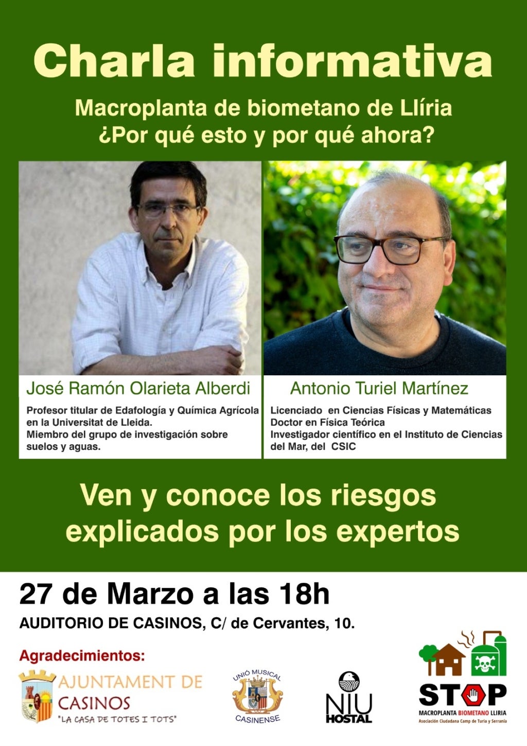 L’Associació Ciutadana Camp de Túria i la Serrania ha organitzat una trobada oberta per a analitzar el projecte de macroplanta de biometà a Llíria i els possibles impactes sobre el territori. L’acte tindrà lloc divendres 27 de març a les 18 hores a l’Auditori de Casinos i comptarà amb la participació dels experts independents Antonio Turiel i José Ramón Olarieta. L’entitat assenyala que l’objectiu de la convocatòria és facilitar informació rigorosa i accessible a la ciutadania davant un projecte que “ha generat inquietud en diversos municipis de la zona, especialment per la seua proximitat a nuclis habitats”. De fet, més de 2.000 persones es van manifestar en contra el gener passat.