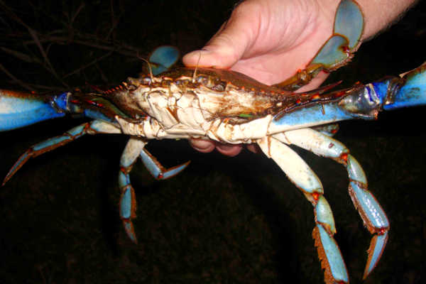 Cranc blau en la mà d’un pescador. Foto: Consorci Desembocadura del Riu Millars.