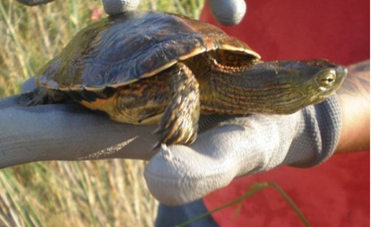 Durant el seguiment de la població de tortugues del Pont Sec, els voluntaris del Projecte Emys també han capturat un exemplar de Trachemys scripta, més coneguda com tortuga de florida, que va ser traslladat al Centre de Recuperació de Fauna La Granja del Saler. Aquesta espècie exòtica invasora i originària d’Amèrica representa un dels majors perills per a la conservació de les nostres tortugues autòctones, juntament amb la urbanització i fragmentació del territori i la contaminació i degradació dels nostres ecosistemes aquàtics.