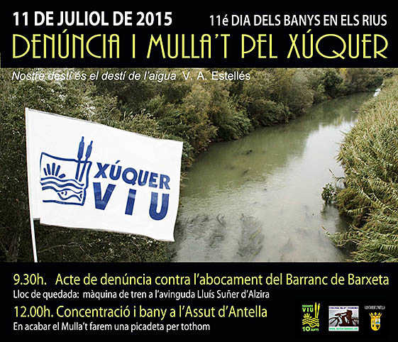 Xúquer Viu celebra el 9è MULLA’T PEL XÚQUER, el dia europeu del bany en els rius, el proper dissabte 11 de juliol, amb una acció de denúncia al Barranc de Barxeta a les 9:30 del matí i amb la concentració i bany a les 12:00 a l’Assut d’Antella.