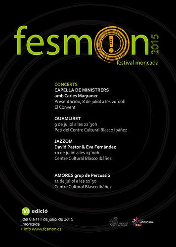 Pel que fa al cartell de concerts nocturns, les propostes són ben diverses, començant el dia 8 de juliol al Convent (20:00h) amb Carles Magraner qui assumirà la direcció de la seua Capella de Ministrers, concert que servirà de marc idoni per fer la presentació del Fesmon 2015. El 9 de juliol al pati del CC Blasco Ibáñez (22:30h) actuarà el grup de folk Quamlibet. El dia 10 de juliol al CC Blasco Ibáñez (23:00h) apareix el jazz amb David Pastor & Eva Fernández amb l’acompanyament de Jazzom. El punt i final al festival el posaran AMORES Grup de percussió el dia 11 de juliol al CC Blasco Ibáñez (22:30h)
