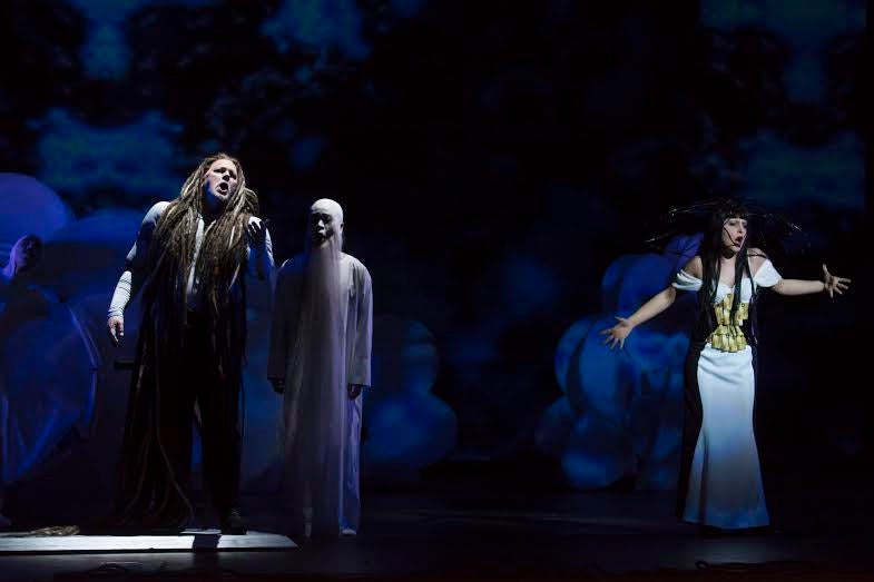 Dins del repartiment destacaren les intervencions dels baixos, tots ells amb bona disposició, amb veus timbrades, amb cos i projecció, amb papers secundaris però que funcionaren quan se’ls requerí la qualitat que per altra banda abaixava André Heyboer en el paper de Summe Sacerdot qui de tots, probablement fou qui mes patí la juguesca de l’escenògraf. Amb una veu preciosista, amb bon timbre i arrodonida, però que no té projecció i queda esmorteïda. A propòsit dels sons esmorteïts, cal afegir l’ús i abús de col·locar panells per davant de les veus, justificat per les videocreacions projectades que ajudaven a imaginar —amb molta imaginació— les ubicacions dels quadres. Al remat, en la part vocal hi hagué una ovació unànime cap a Varduhi Abrahamayan per fer fantàsticament la seua feina i per assumir la dels altres.