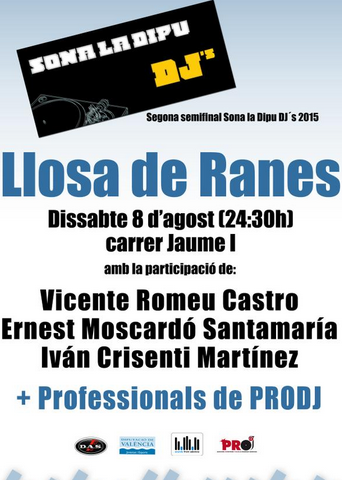 El municipi de la Llosa de Ranes (la Costera) serà l’escenari aquest dissabte de la segona semifinal del certamen musical ‘Sona la Dipu DJ’s 2015’ que organitza la Diputació de València, segons ha informat la corporació provincial en un comunicat.