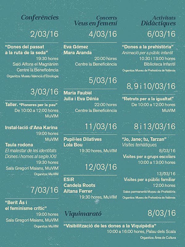 El dissabte 5 de març a les 22.00, també en la Beneficència, actuarà Maria Faubel, una de les joves promeses de la cançó en valencià guanyadora del segon premi de la XII edició del Circuit de Música en Valencià. Així mateix, estaran en cartell el grup de pop Júlia, hereu del British Style, i Eva Dénia, amb cançons de jazz i ecos brasilers, La tercera cita de ‘Veus en femení’ serà el divendres 11 de març en el Museu Valencià de la Il·lustració i de la Modernitat (MuVIM). A partir de les 19.30, actuaran el grup Pupil·les Dilatives, un nou exponent del hip-hop raper en valencià, i Lola Bou, l’actriu cantant coneguda pel seu pop de piano.