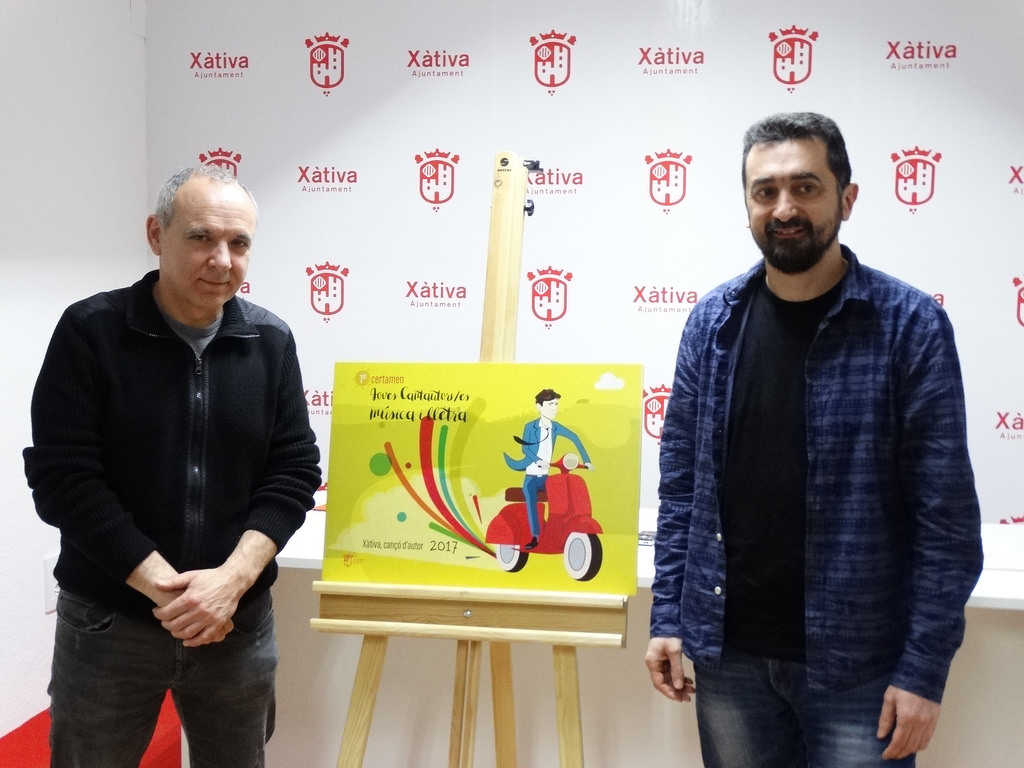 El regidor de Gran Teatre, Alfred Boluda, i el cantautor xativí Feliu Ventura han presentat aquest matí la primera edició del Certamen de Cantautors i Cantautores de Xàtiva com a avanç de la programació del que serà l’edició d’enguany del festival Música i Lletra. Es tracta d’un concurs adreçat a cantautors d’entre 14 a 35 anys que no hagen editat cap disc. És un certamen obert a la participació d’autors internacionals que compta amb diversos premis en metàl·lic.