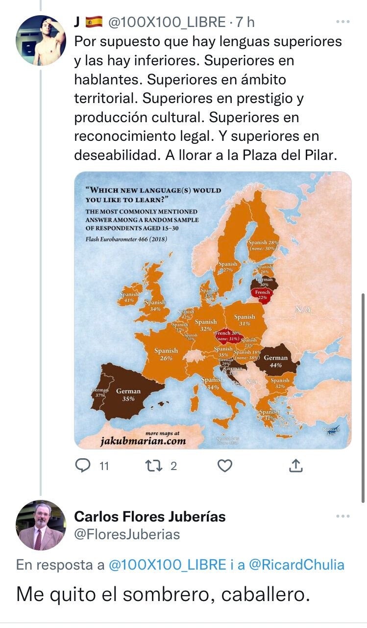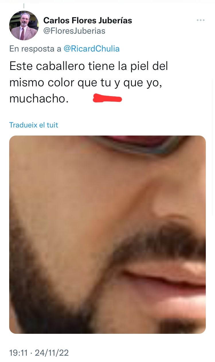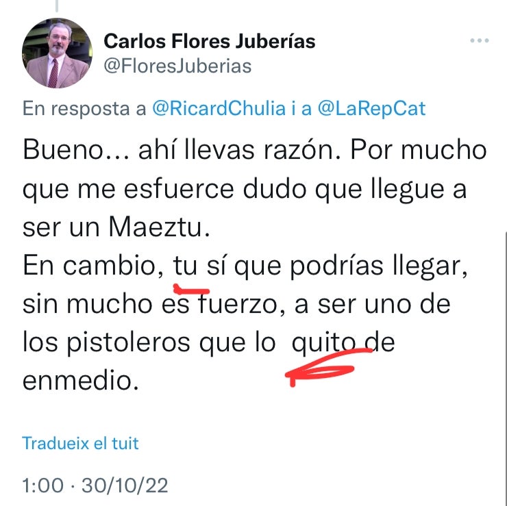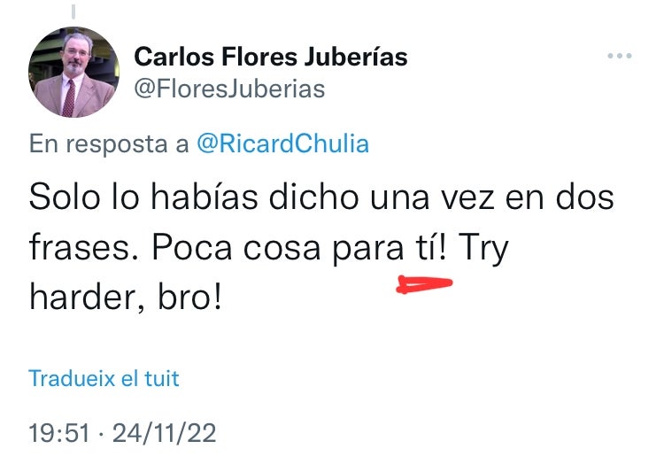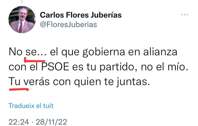 Sobta, alhora, aquest supremacisme quan el catedràtic, entusiasta defensor del castellà i ostentador de la màxima posició acadèmica possible, comet faltes d’ortografia, de puntuació i de sintaxi en aquest idioma pràcticament a cada tweet. Sense anar més lluny, en el fil en què anuncia la seua candidatura, publicat dijous al matí Carlos Flores Juberías enllaçava quatre piulades, tres d’aquestes amb faltes.