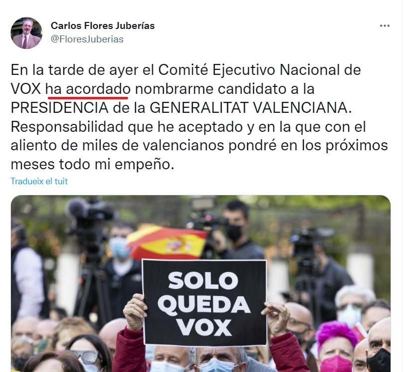 Vox ha anunciat que el seu candidat a la Generalitat el 2023 serà Carlos Flores Juberías. Es tracta d’un catedràtic de Dret Constitucional a la Universitat de València que, tot i defensar la Constitució de manera entusiasta, procedeix d’un món que no és, ni de bon tros, constitucionalista. De fet, el catedràtic integrava les llistes de Fuerza Nueva a València el 1982, la candidatura que aglutinava els nostàlgics del franquisme i que liderava el mediàtic Blas Piñar.