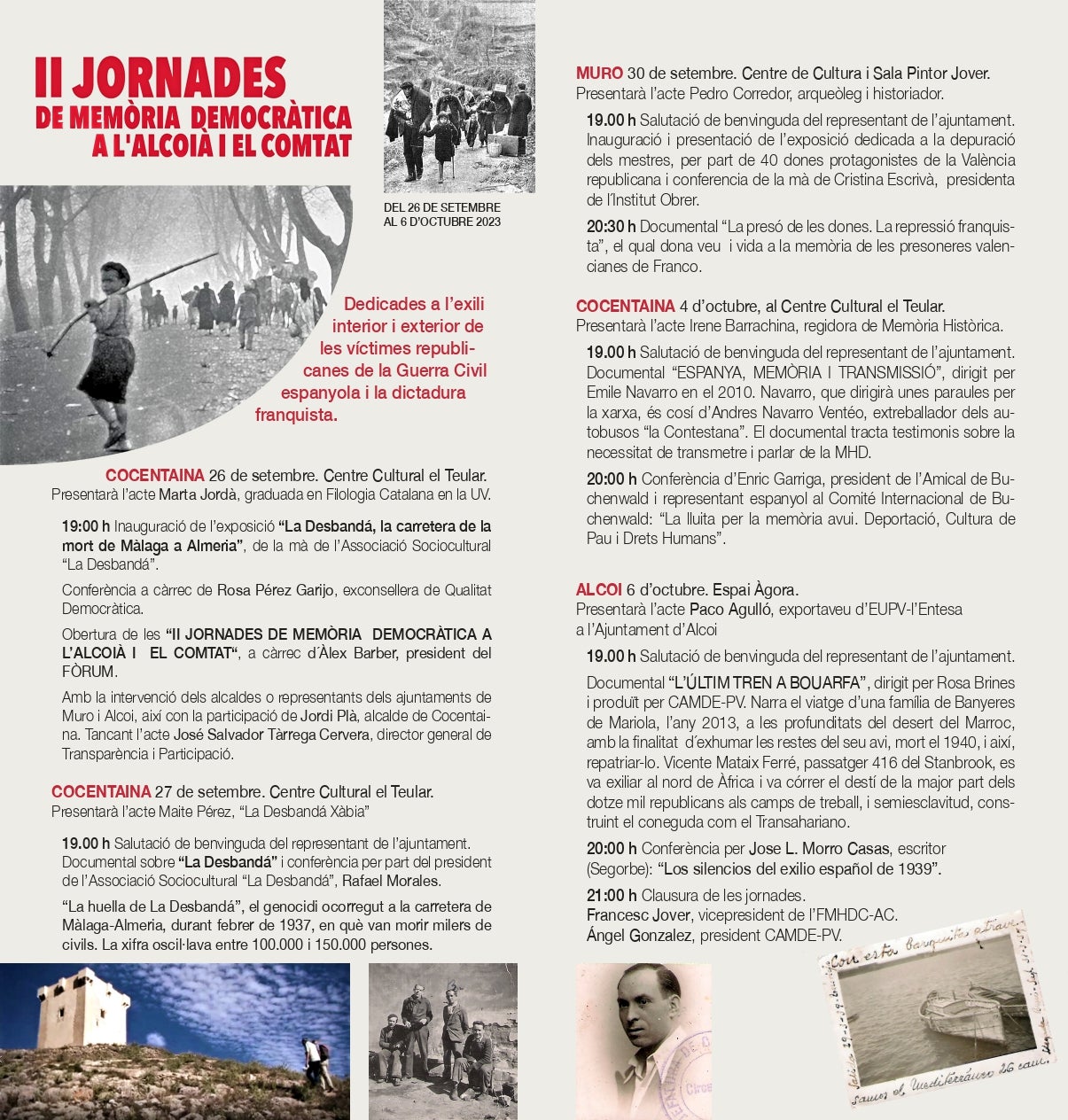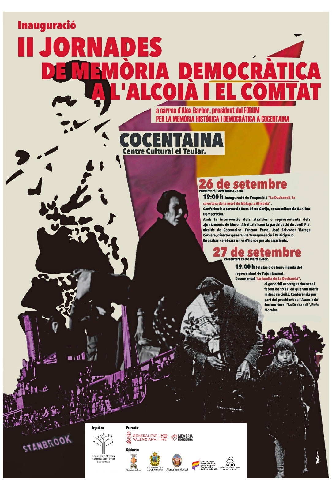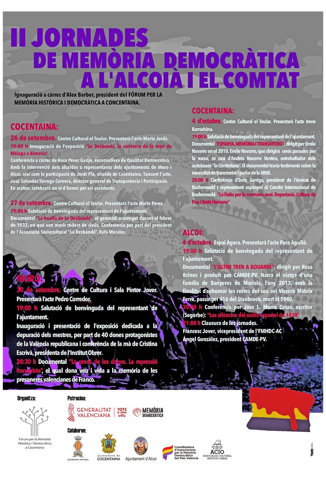 Aquest 26 de setembre començaran les II Jornades de Memòria Democràtica a l’Alcoià i el Comtat. L’esdeveniment, que s’allargarà fins al 6 d’octubre, s’estrenarà al Centre Cultural el Teular de Cocentaina, i estarà dedicat a l’exili interior i exterior durant la Guerra Civil i durant la dictadura franquista. Els actes es repartiran entre Cocentaina, Muro i Alcoi, i l’objectiu de la iniciativa és reflexionar i fer noves aportacions sobre un dels períodes més foscos de la història de l’Estat. A més a més, contribuiran a mantenir viva la memòria dels que van patir i lluitar per les llibertats i la democràcia i reflexionaran sobre el seu llegat i la seua vigència en la societat actual.