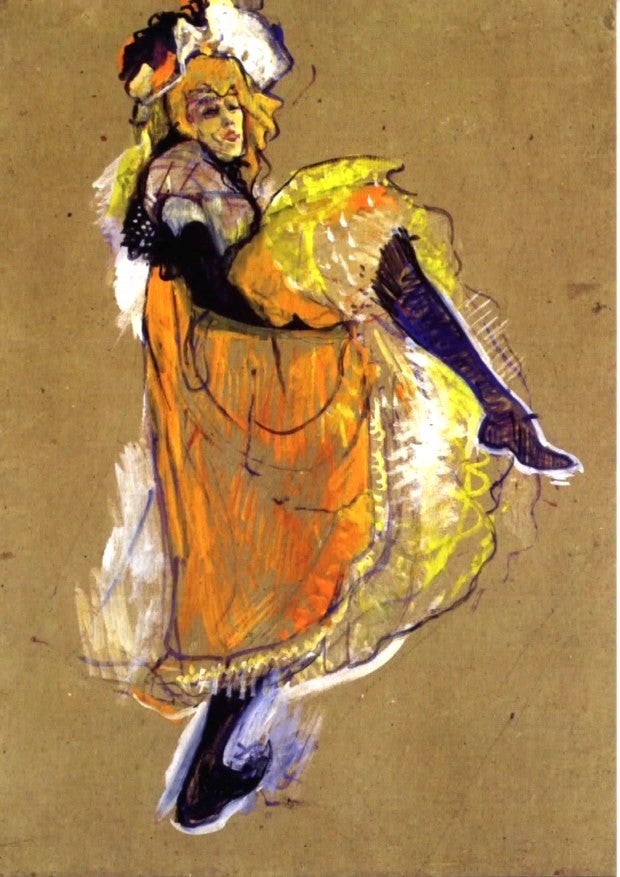 Es lleva la jaqueta i s’arromanga la camisa per tal de remenar els quadres amb més comoditat. «L’he pintada sobre llenç, sobre cartró, sobre paper… L’he dibuixada entrant alMoulin Rouge, eixint del Folies Bergères, ballant com una possessa enmig de la pista del Jardin de Paris….», pensa mentre col·loca damunt de la butaca de vímet l’obra original del cartell que el va llançar a la fama. També a la model, ja que l’anunci de l’espectacle nocturn amb la seua imatge va omplir els principals quioscs de la ciutat. «La fluïdesa de l’oli diluït en l’essència de trementina em va permetre captar el joc trepidant de les cames, l’elegància de l’estilitzada silueta dansant com si estiguera endimoniada!» Assegut al tamboret, l’observa amb atenció. Sens dubte, va aconseguir l’objectiu, va atrapar l’instant. Va capturar el moviment nerviós i les evolucions quasi acrobàtiques de la jove amb traços solts i vigorosos. «La noia dels tirabuixons rojos és prima i flexible com un jonc! Pot doblegar-se enrere fins escombrar el terra amb els cabells!», rumia. Recorda el primer dia que la va veure, acabava de complir els vint anys i havia fet carrera des dels setze al Barri Llatí.