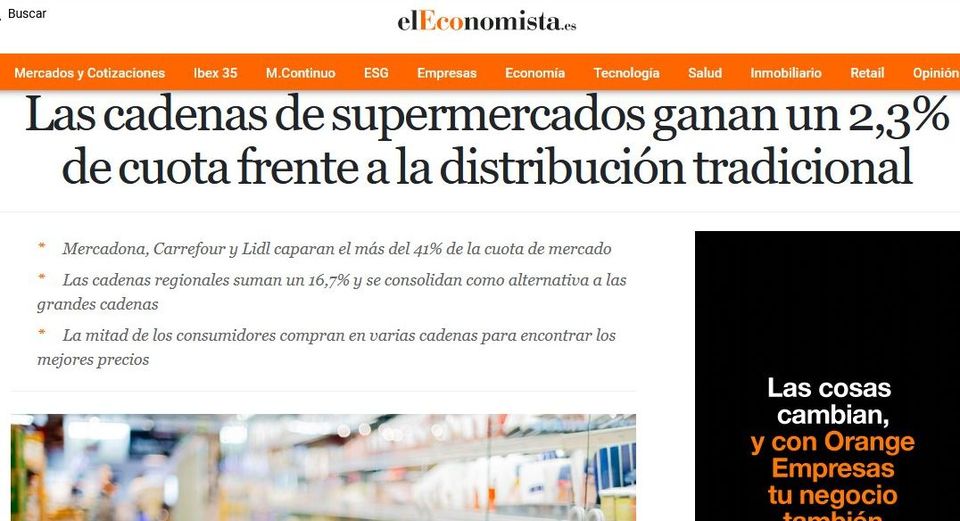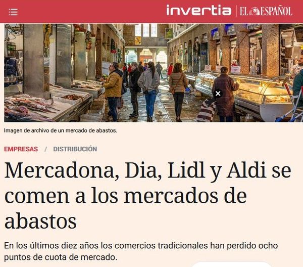 «Mercadona, Dia, Lidl i Aldi es mengen els marcats d’abastos». No ho dic jo, ho diu aquest titular d’El Español, gens sospitós d’anticapitalista o antisupermercats. El cos del text encara és més demolidor: «Fa deu anys el 40% de la despesa en frescos es produïa al canal tradicional. Hui en dia, açò s’ha reduït un 10% i l’ha guanyat la distribució moderna», és a dir, les grans cadenes de supermercats.