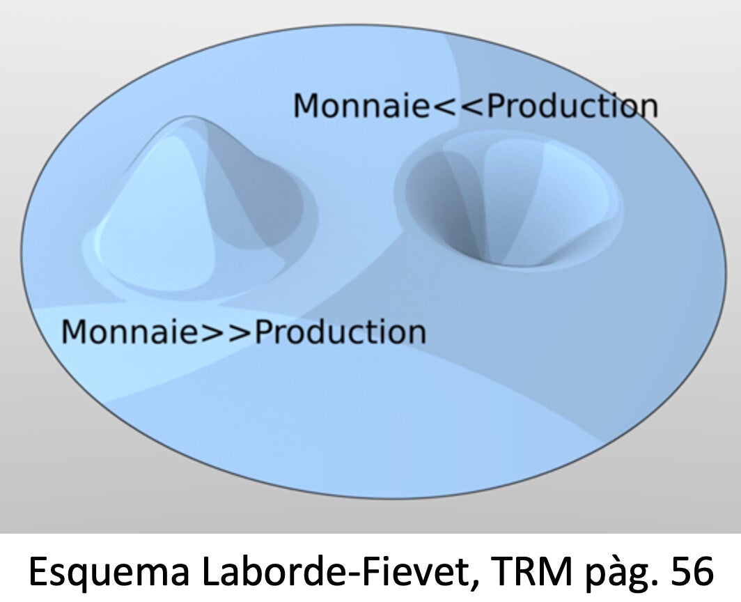 Les conclusions de Laborde són les mateixes, com dic, però ho fa concebent i desenvolupant una estructura teòrica per a analitzar els sistemes monetaris. L’objectiu fonamental és comparar el sistema hegemònic centralitzat amb la seua proposta descentralitzada basada en el dividend universal. Enginyer de formació (en l’estimable tradició francesa d’enginyers-economistes1), Laborde evidencia el seu gust pel rigor duent la TRM al terreny del codi concís, poderós, de la matemàtica, un llenguatge capaç de concentrar en una equació, que l’expert interpreta amb un colp de vista, el que necessitaria un manoll d’enrevessades pàgines de llenguatge verbal.