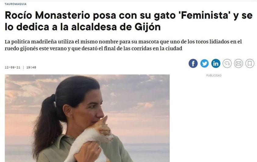 Aquesta cooperació es fa més evident quan els intents de troleig de l’extrema dreta són més obvis i simples. Com per exemple l’intent de Rocio Monasterio d’allargar la polèmica per la retirada de les subvencions a les corregudes de bous a Xixón després que es fera públic que un dels bous a sacrificar li deien Feminista. Vox té en el món de la lídia un nínxol electoral preferent i –contradient la seua suposada actitud contra la subvenció i la pagueta- ha criticat durament la decisió de l’ajuntament asturià. I com ho fa? Doncs posant al seu Instagram amb una gateta a la qual anomena Feminista. La imatge ho té tot: gatets –els reis d’internet-, imatge suau, explotació del conflicte, troleig, viralitat… Tot menys una cosa: noticiabilitat.