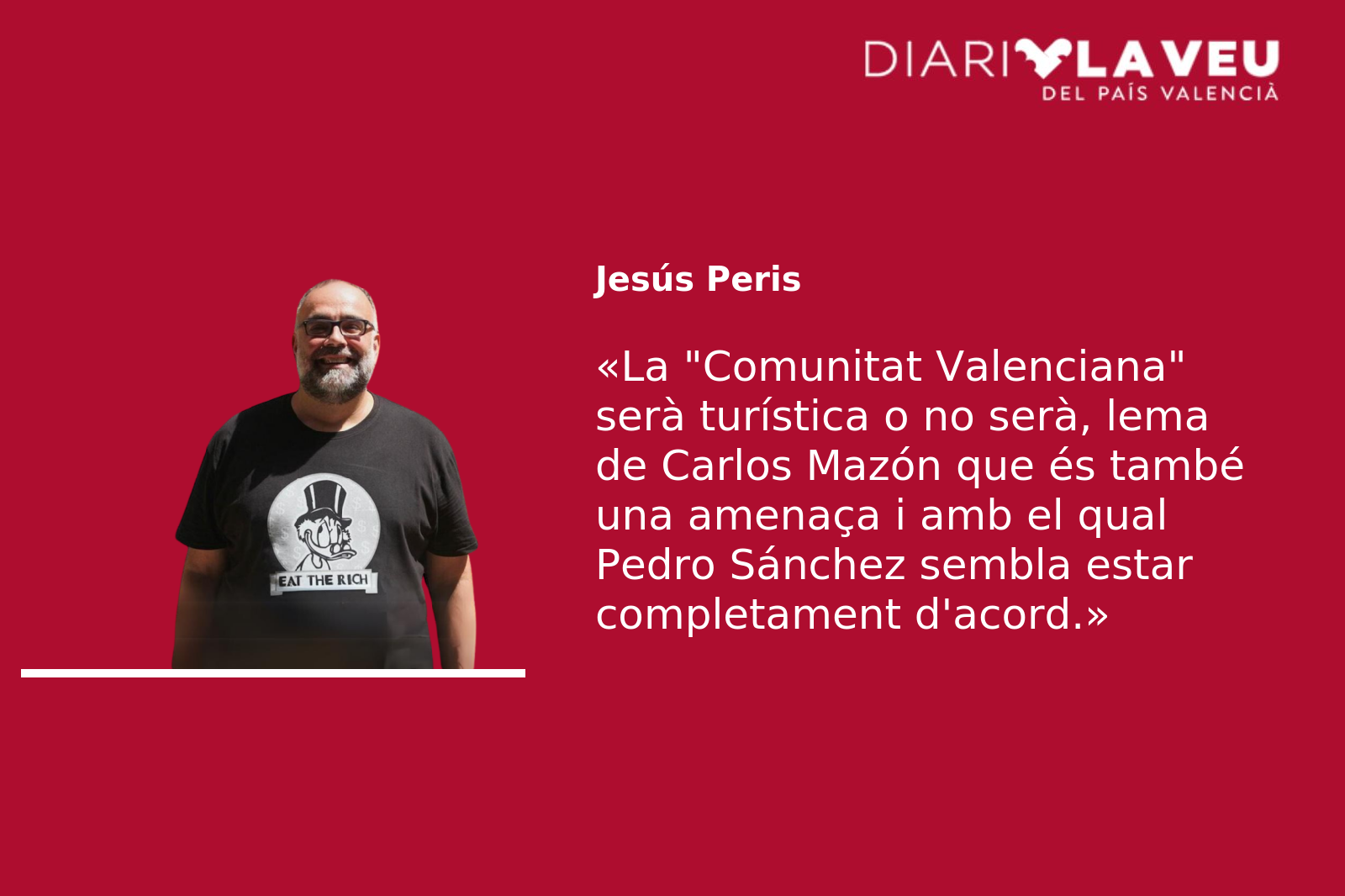 L’altre dia vaig sentir Carlos Mazón explicant una de les que sembla ser mesures estrela del seu govern per a la recuperació dels estralls de la dana: l’abonament turístic perquè les persones de les zones més afectades reben tres-cents eurets per a… fer turisme! Clar que sí, perquè es relaxen, perquè gaudisquen a tot confort i perquè una vegada més una part de l’erari públic vaja a parar a les butxaques de l’hostaleria. Això els de las paguitas. Neoliberals per a qualsevol cosa que implique redistribució o serveis socials, però sempre disposats a transferir diners dels nostres impostos als empresaris amics. En això cal reconéixer-li coherència. Crec que tots i totes tenim clar que si es va resistir tant a donar l’alarma o fins i tot a posar-se ell mateix en mode emergència no només és perquè no anava a perdonar un dinarot en bona companyia, sinó també perquè eixe cap de setmana hi havia pont. I les prioritats són les que són, no siga cosa que una alarma a temps generara cancel·lacions.