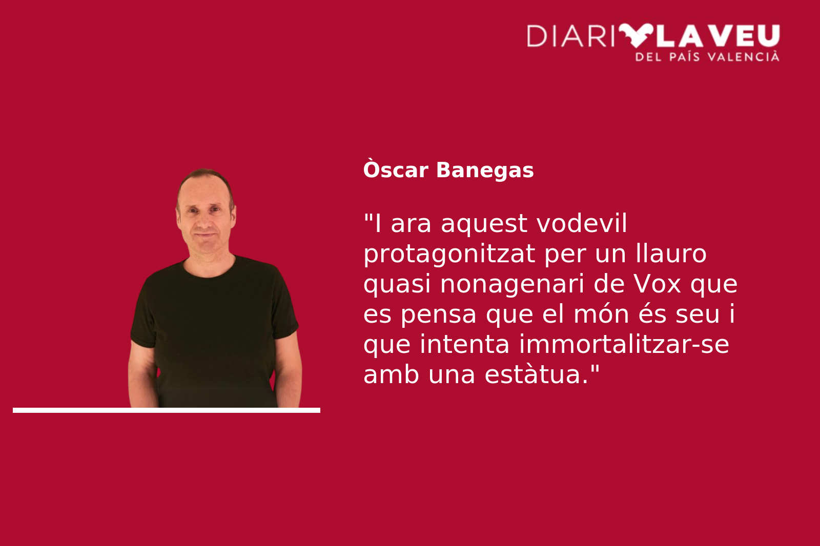 Al remat, aquest senyor amb el mateix bronzejat que Trump ens està donant dies de glòria i motius per a fer un fart de riure. Més que kafkià, l’assumpte és berlanguià, més casolà, proper i nostre. L’embolic té tots els ingredients per a una pel·lícula o un sainet, com vulgueu: un xiringuito, unes escriptures més falses que el curriculum vitae de Noelia Núñez, un senyor de 86 anys tronat que intenta omplir-se les butxaques apropiant-se de sòl públic, un ermità cambrer més trastocat que el seu amo, que ja és, una creu de 40 m d’altura amb llums i ascensor a l’estil de la de San Lorenzo de El Escorial… Si Berlanga o Bernat i Baldoví ressuscitaren, no els faltaria material per a una gran obra. Tot molt còmic, sí, però hi ha necessitat d’un espectacle tan ridícul i lamentable? Entre els currículums inflats, les vint-i-escaig faltes d’ortografia, gramaticals i lèxiques de l’alcaldessa en funcions de València i ara aquest vodevil protagonitzat per un llauro quasi nonagenari de Vox que es pensa que el món és seu i que intenta immortalitzar-se amb una estàtua, quin estiu més divertit que estem tenint, xe!