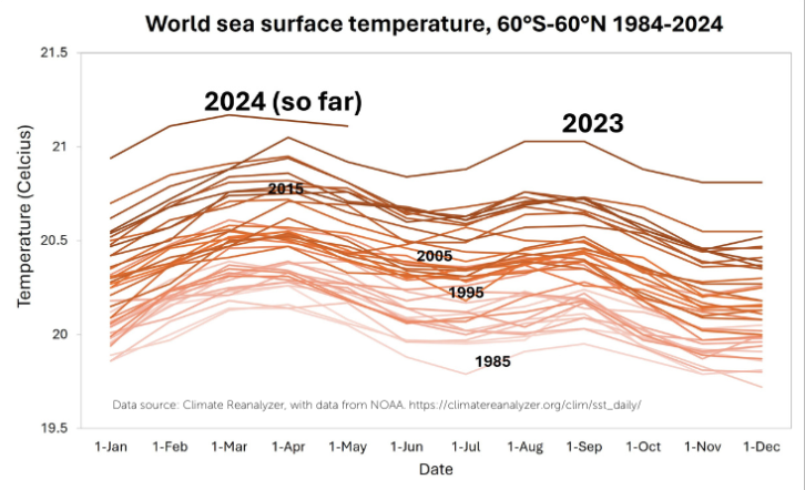 Perquè fa més o menys un any, que la temperatura mitjana del planeta es va desacoblar del que seria normal en aquesta època de l’any. No és ja que fora extraordinàriament alta o que superara la mitjana. No. És que senzillament trencava les gràfiques i se n’anava clarament per fora. S’acabaven de superar els famosos 1,5 graus per sobre la mitjana de temperatures de l’era preindustrial –el llindar que els científics consideren com un punt de no retorn per al clima- i ja estem dotze mesos, tot un any així, amb una mitjana global d’1,69 graus per sobre el llindar amb llocs com el País Valencià molt per sobre, fregant ja els dos graus.