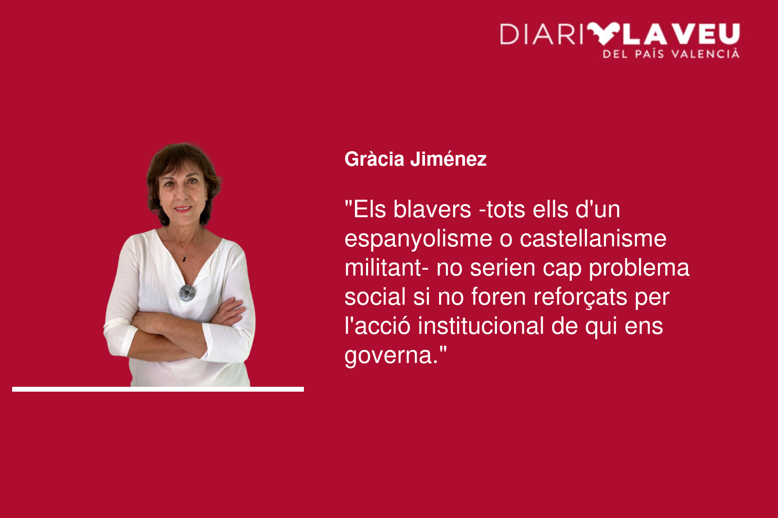 Els blavers -tots ells d’un espanyolisme o castellanisme militant, hem de dir-ho- no serien cap problema social, si no foren reforçats i amplificats per l’acció institucional de qui, ara per ara, ens governa. Els blavers serien només una minoria del món friqui, com els therians o els trekkies, per posar exemples. El problema és que dirigents amb competències i pressupost -Diputació de València, Ajuntaments de València i Alacant, Conselleria d’Educació…-, abracen interessadament el secessionisme de tuf blaver, i que, en ares del poder dels quatre anys de legislatura que tenen, sí que representa el perill de l’aniquilació i la substitució lingüística nostra, que és el que al remat semblen buscar. S’ha dit massa voltes: la gent no vol problemes, i el valencià, presentat com a problema -tot i que encara amb resistència popular-, molesta en el procés de conversió d’un País en tres províncies sense ànima que és el que al remat la dreta vol que siguem els valencians, un poble sense ànima, dividit, desmoralitzat.
