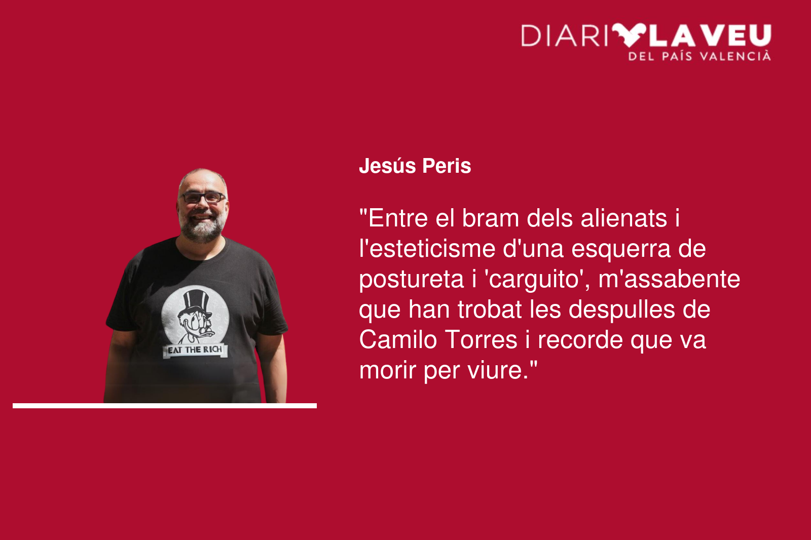 I aleshores, en mig de tot això, entre el bram dels alienats i l’esteticisme d’una esquerra de postureta i carguito, m’assabente que han trobat les despulles de Camilo Torres i recorde que va morir per a viure, com va cantar un poeta. La lluita continua i no és una fase feta. Continua més enllà de la nostra voluntat de lluitar-la. Anem perdent-la des de fa molt de temps. Seria una llàstima acabar de perdre-la per incompareixença. I aleshores m’aclame impotent al Déu de Camilo Torres, al que després de la bala cridava revolució, i li pregue que tinguem la força per a no complaure’ns més en la melancolia.