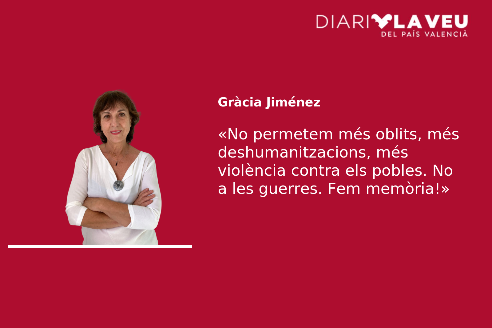 Els cicles històrics van molt més enllà d’una vida humana i els conflictes no resolts per anteriors generacions, passen temporalment a l’oblit, fins que desperten… Com és el cas de les guerres d’Orient Mitjà. Per poder superar-los hem de capbussar-nos en la història, que ens donarà les claus, els perquès, i s’han de fer propostes basades en els pactes. Per això hem de lluitar contra l’oblit. Un oblit sempre interessat de part, de la part de qui es creu guanyador, és clar -no és casual que ni el PP, ni Vox, vullguen saber res de la Llei de Memòria Històrica, ni Israel perquè està allí, a Palestina, des del 1948-. Però quan una ferida no es tanca, els desagravis tornen en forma de violència. Pobles com el palestí o el sahrauí ho saben bé. El seu territori, per diferents motius -estratègics o econòmics- és cobejat per Estats més forts, amb poderosos aliats. Vivim en una mena de bucle etern. De vegades es prenen solucions radicals que capgiren el curs de la Història, però resta el tarquim. Les bombes d’Hiroshima i Nagasaki tancaren una guerra: però acabaren les tropes aliades amb l’extrema dreta europea, representada dramàticament en aquell temps pels terribles nazis? Evidentment, no. La seua potent resurrecció tants anys després ho demostra. No permetem més oblits, més deshumanitzacions, més violència contra els pobles. No a les guerres. Fem memòria!