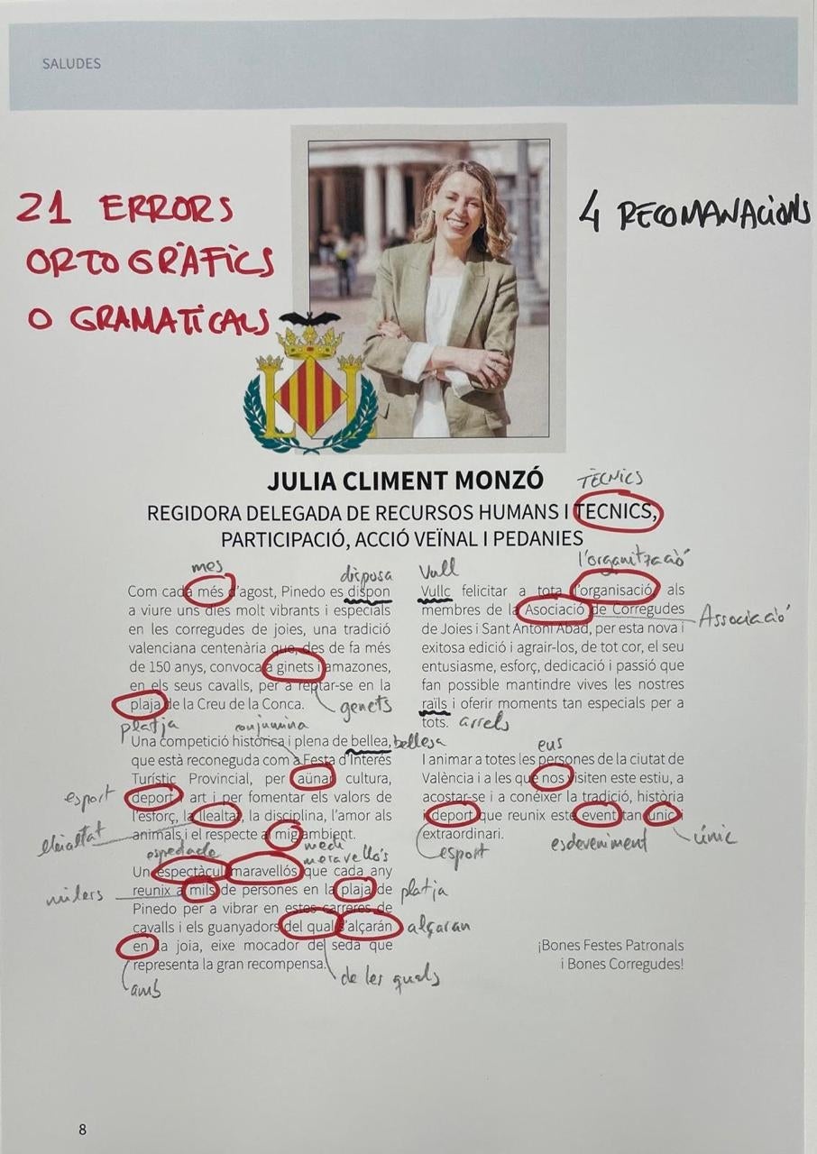 Tecnics (tècnics), més (mes), ginets (genets), plaja (platja), aünar (conjuminar), llealtat (lleialtat), mig ambient (medi ambient), espectàcul (espectacle), maravellós (meravellós), mils (milers), del qual (de les quals), alçarán (alçaran), en (amb), organisació (organització), asociació (associació), nos (ens), event (esdeveniment) i unic (únic). Aquesta és la llista de les díhuit errades ortogràfiques, gramaticals i lèxiques que la regidora de Pedanies de València, Julia Climent Monzó, i també alcaldessa en funcions en substitució de María José Catalá (de vacances sobrevalorades) ha comés en un breu text de només cinc paràgrafs i mitja pàgina publicat en el llibret de les festes de la Correguda de Joies de Pinedo, una celebració amb més de segle i mig d’història que enguany té lloc del 14 al 16 d’agost en aquest barri del sud de València. Hi ha quasi més faltes que paraules.