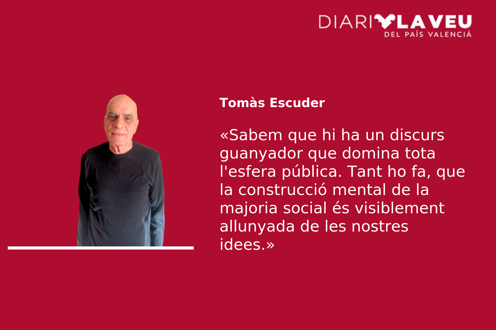 Sabem que hi ha un discurs guanyador que domina tota l’esfera pública. Tant ho fa, que fins i tot la construcció mental de la majoria social és visiblement allunyada de les nostres idees. Les tenim i fem propostes i suggeriments, com es pot comprovar a través de les opinions de molta gent que ací escriu, que podrien servir al debat sobre el país. Però què passa? El fet és que no transcendim i el nostre discurs queda per a nosaltres i poca cosa més.