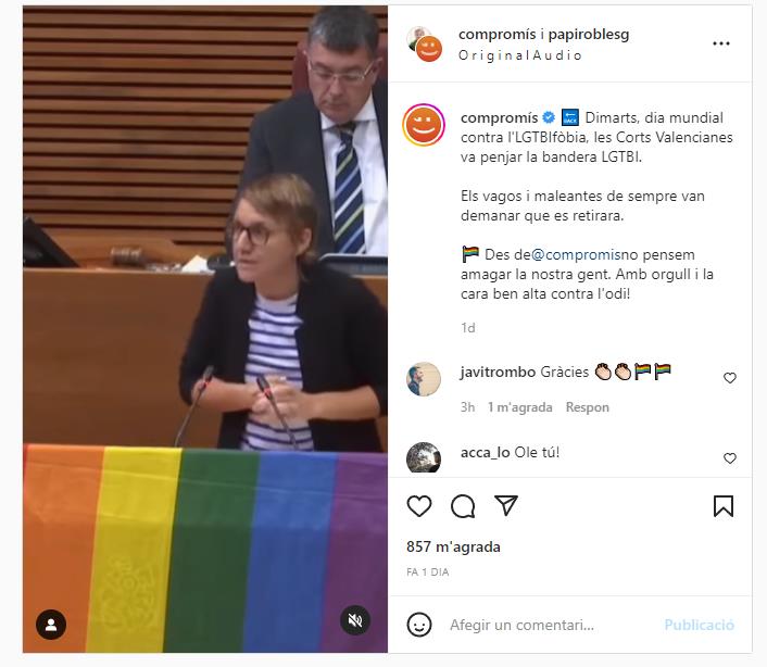 El 17 de maig és el Dia Internacional contra la LGTBI-fòbia i per recordar-ho, les Corts van penjar la bandera de l’arc de Sant Martí. Com era esperable, Vox va exigir la seua retirada, a la qual cosa la síndica de Compromís, Papi Robles, els va respondre amb un discurs de tons èpics –més èpic encara amb la música escollida per al muntatge– on recordava que mai renunciaran a eixa bandera «mentre hi haja un xiquet que patisca bullying a l’escola, mentre hi haja una persona trans que perda la faena per mostrar la seua identitat, mentre algú veja els seus drets menystinguts».