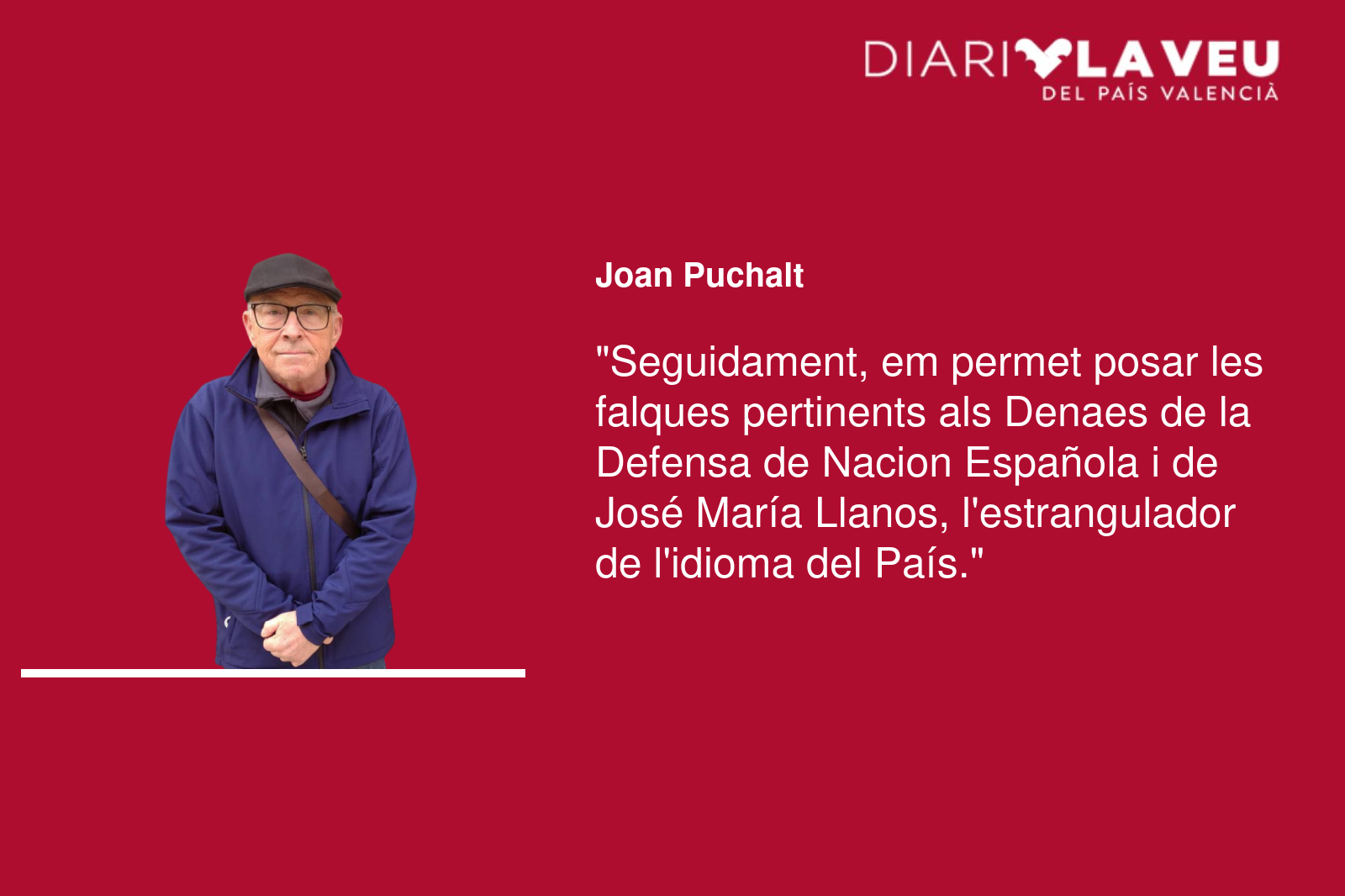 Amigues i amics, les meues ires i les vostres, adquirides progressivament al llarg del temps i l’anomenada transició democràtica, resten encara presents i és hora que d’una vegada per totes plantem cara a tota aquesta gentola, i no ens val de cap manera ajornar-ho. Seguidament, em permet posar les falques pertinents als Denaes de la Defensa de Nacion Española i de José María Llanos, l’estrangulador de l’idioma del País, mitjançant aforismes de Fuster i poemes d’Estellés. Per tant, heu-los tot seguit.