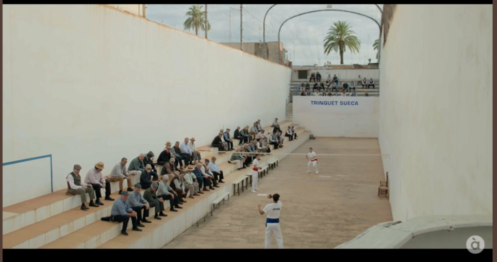 A Massamagrell tots els figurants no anàvem cada u a la d’ell, sinó que érem del mateix país, estàvem units, no importava el nostre origen, ni les idees, actuàvem com una única afició apassionada per la tradició de la pilota valenciana. A les graderies vam suportar el sol del matí i el de la vesprada, tant a l’escala de quatre graons com a les galeries, sempre ben atesos per la producció. Els figurants vam gesticular, vam aplaudir, vam cridar, vam somriure i vam patir, ens vam alçar plens d’entusiasme, vam representar que féiem travesses i que apostàvem a favor dels rojos o dels blaus, amb butlletes de paper i tot, com en la realitat. Un de nosaltres feia el paper de padrí, una institució al trinquet, el que recomana un jugador al trinqueter. Els figurants ens vam prendre aquella escena com una partida de debò. I el resultat va ser esplèndid. El mateix director ens va manifestar en un missatge per escrit l’agraïment per l’actuació i la satisfacció pel resultat.