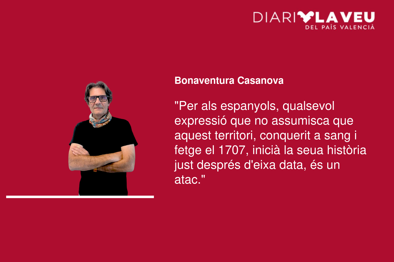 Però no oblideu que nosaltres, els valencians, som catalans, i només el fet d’haver assumit que no ho som ja ens condemna a la desaparició. Passa igual amb la llengua: ja no parlem català, poca gent vol recordar que el valencià no és altra cosa que la llengua catalana parlada al sud del territori. Però, de nou, assumim alegrement que ells li canvien el nom. A nosaltres tant ens fa, ja que sabem que parlem català; tot i que ens obliguen a dir-li valencià, no passa res. Però sí que passa, i molt. De nou, ja estan a punt de prohibir que es diga “català”, i si a algú se li ocorre anomenar-la així, prompte els guardians del pensament correcte s’afanyen a dir que no cal ser radicals, que no cal espantar l’enemic, que siguem bons minyons i parlem de valencià-català, que així ens anirà millor. Quan, de fet, ningú, tret d’alguns benintencionats, fa servir aquesta doble denominació, tan inútil en termes d’identitat nacional com la broma del nom que ens van clavar.
