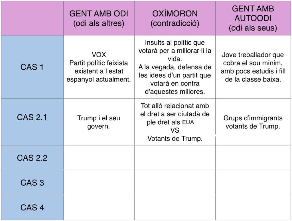 Recopilem a la graella següent els termes lingüístics i socials (en rosa) amb els exemples exposats en els casos 1 i 2.1.