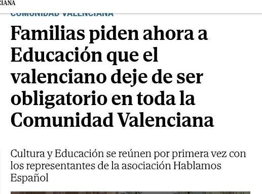 Així, quan es tracta de reclamar més castellà a l’escola, són «les famílies», com en el titular d’aquesta notícia apareguda aquesta setmana. En realitat, aquest «famílies» és un eufemisme d’una entitat marginal, sense cap pes rellevant en la comunitat educativa valenciana i amb un clar biaix ideològic molt pròxim a Vox. Sense que açò li lleve cap dret a manifestar-se o a reclamar el que considere, queda clar que són un grup d’interés concret, igual com ho poden ser Escola Valenciana o les FAMPA, únicament que molt menys representatiu que aquestes.