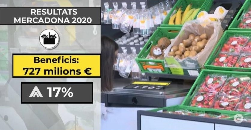 Sí, és obvi que À Punt no ha sabut escapar-se d’aquest Dia d’Orgull Mercadonil. També les notícies van cobrir la roda de premsa, limitant-se a repetir les dades ofertes per l’empresa sense posar-hi context. Per exemple. Quan es diu que «L’any de la pandèmia, Mercadona ha obtingut 727 milions d’euros de benefici, un 17% més que l’any anterior i també ha venut més, 26.932 milions, un 5,5% més». Però just després apareix Roig explicant que la pandèmia «els ha eixit cara». Amb la informació que tenim a l’abast, no es pot saber, però resulta com a mínim cridaner que els beneficis pugen més que les vendes, o siga, que no només ha venut més —els confinaments han beneficiat els supermercats per sobre d’altres competidors com la restauració o els mercats tradicionals— sinó que a més ha guanyat marge de benefici, i això a pesar de l’enorme despesa en seguretat i neteja. Si els números grinyolen, potser la notícia hauria d’explicar com s’ho ha fet Mercadona per incrementar beneficis per sobre de les vendes en aquest context i no deixar-nos amb la sospita que han aprofitat la manca de competidors per apujar els preus.