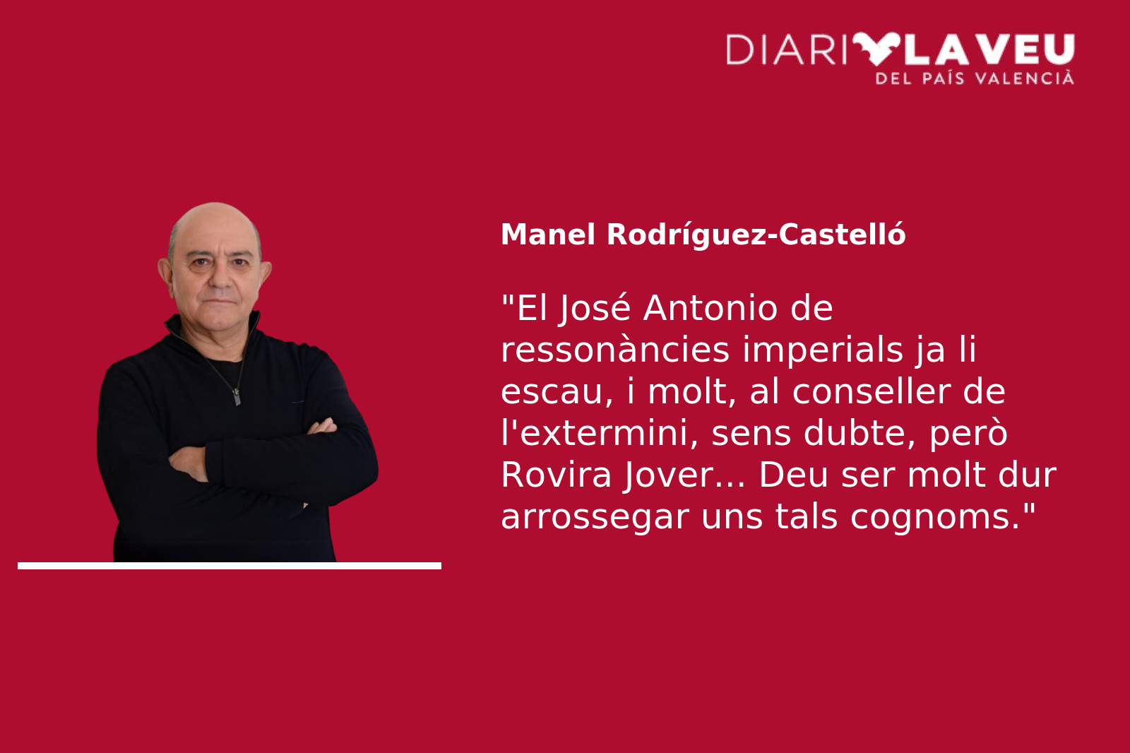 El José Antonio de ressonàncies imperials ja li escau, i molt, al Conseller de l’extermini, sens dubte, però Rovira Jover… Deu ser molt dur arrossegar uns tals cognoms i ser de Sant Vicent del Raspeig, topònim que encara no han pogut traduir, per a qui es vol espanyol d’espasa i martell i pretén imposar la seua identitat als altres, podent-se dir Robledo o Robledal i Yuntero! Encara que molts s’han venut per moltes menys monedes, això no el disculpa de cap manera.