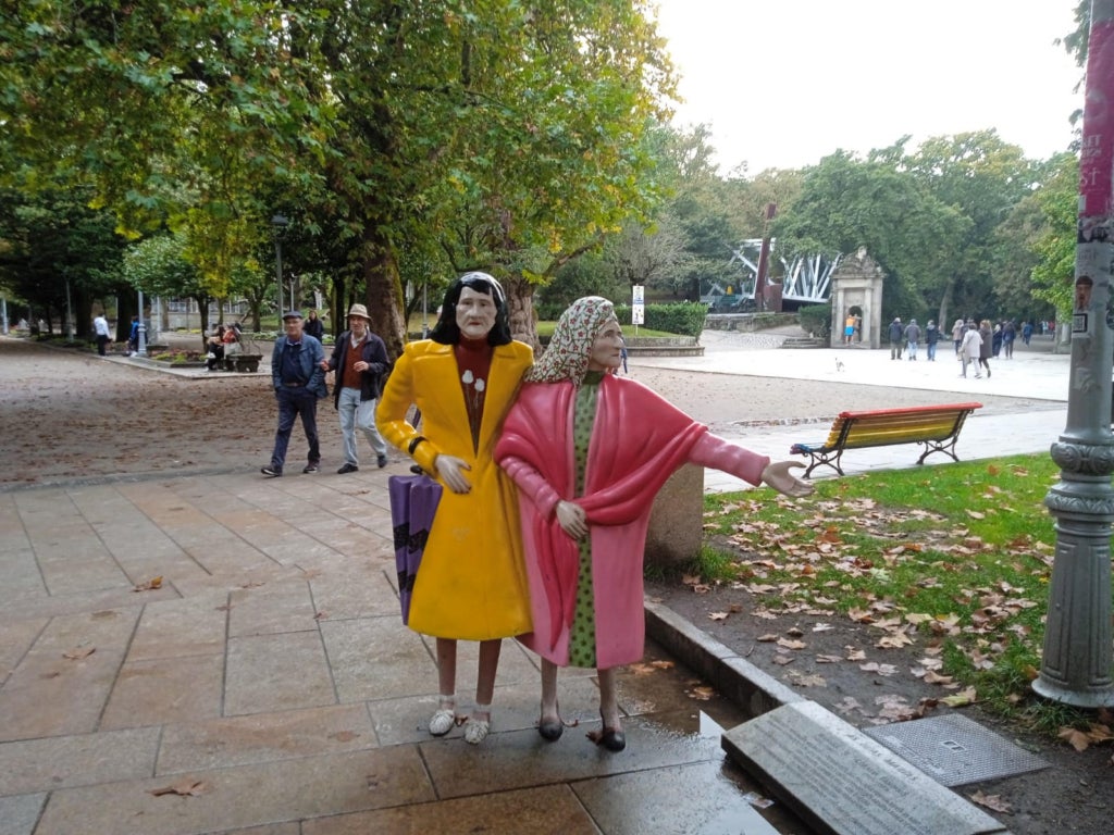 D’una banda, parle de as dúas Marías, dues germanes compostel·lanes de nom Maruxa (1898-1980) i Coralia (1914-1983) Fandiño Ricart, que van ser uns personatges populars de la ciutat pel fet de passejar, durant les dècades de 1950-1960 i fins a final de la de 1970, vestides i maquillades d’una manera estrafolària i excèntrica a les dos en punt de la vesprada (per això també eren conegudes com as dúas en punto), la qual cosa representava tot un contrast, i un atreviment, dins l’ambient de repressió de la dictadura franquista. Cal tindre en compte que fumaven i que gosaven tirar floretes als joves universitaris, una cosa culturalment impensable per al sexe femení en aquella època. Però allò que potser molts locals i visitants no saben és que eren filles d’un sabater i d’una costurera que tingueren una prole de tretze fills, i molts dels seus germans militaren activament en l’entitat anarcosindicalista CNT, motiu pel qual hagueren de fugir i amagar-se en temps d’autoritarisme. La policia social del règim es va dedicar a assetjar les dones de la família, la sastreria va ser boicotejada i elles van haver de recórrer a la beneficiència per a poder subsistir. En la terra de Franco, Fraga, Rajoy i Feijóo, les dues Maries constituïren un crit de llibertat. Des de 1994 estan representades amb una escultura situada en el parc de l’Albereda, sens dubte l’escultura més fotografiada de la ciutat santa.