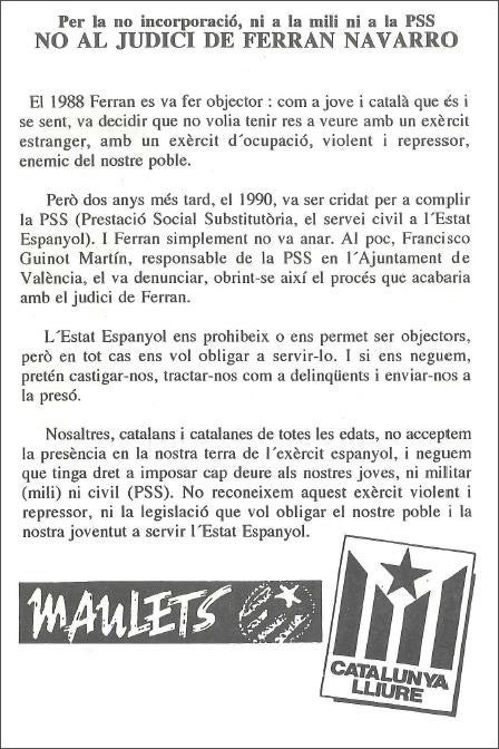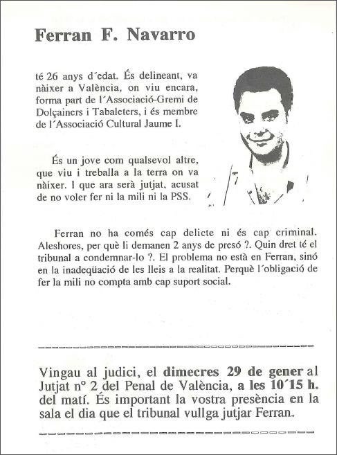 Aquest 29 de gener es compleixen 30 anys del judici que l’estat espanyol em va interposar per un delicte d’insubmissió (no incorporació) a les forces repressives de l’estat espanyol. Aquest va ser un dels centenars de processos judicials contra el jovent (basc i català, principalment) i va ser un judici que va marcar un punt d’inflexió en els processos oberts per aquesta causa arreu de l’estat. El que es va conèixer com a «cas Ferran Feliu», una estratègia de l’esquerra independentista que va donar bons fruits.