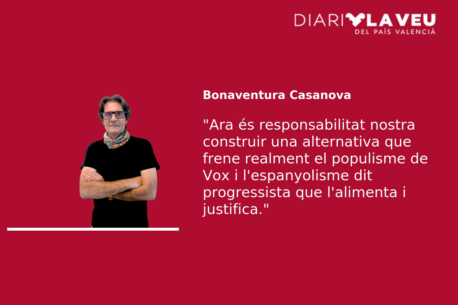 No podem combatre allò que ve de fora, però si hem de combatre els eixos discursius que neixen al nostre entorn i, sobretot, denunciar i contribuir a canviar les condicions econòmiques i culturals que dintre de l’Estat donen suport a eixes postures. Ara és responsabilitat nostra construir una alternativa que frene realment el populisme de Vox i l’espanyolisme dit progressista que l’alimenta i justifica.