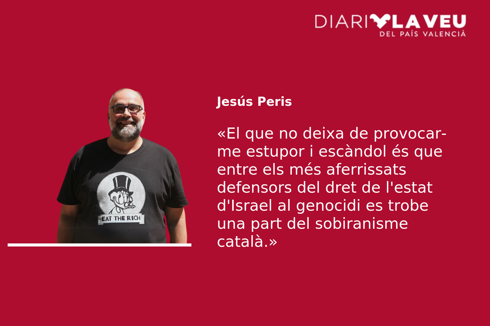 Ara bé, el que no puc entendre, el que no deixa de provocar-me estupor i escàndol és que entre els més aferrissats defensors del dret de l’estat d’Israel al genocidi es trobe una part del sobiranisme català. Llig els seus tuits i sent que alguna cosa se m’escapa, però la seua misèria moral, els tripijocs que fan per defensar l’indefensable, la manera esbiaixada i perversa amb la qual s’identifiquen amb els piolins extrems de l’estat d’Israel, embruta de manera indeleble la seua causa.