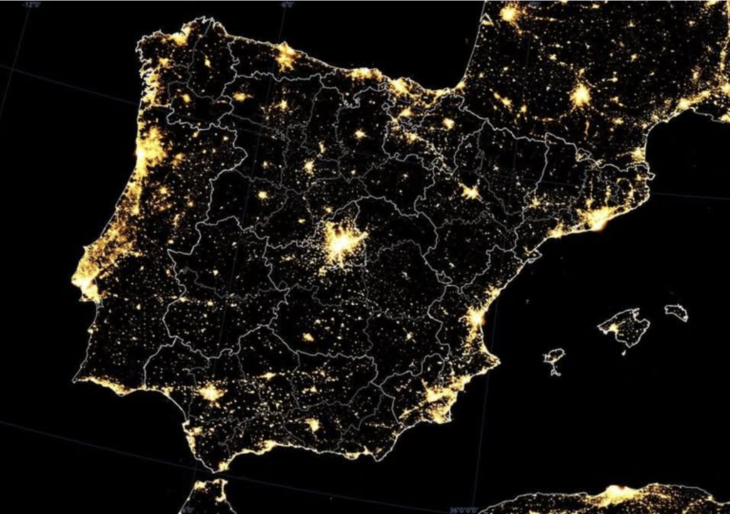 A excepció de l’arc mediterrani —una regió densament poblada i econòmicament potent que l’Estat ha evitat sistemàticament potenciar perquè la percep com una amenaça per al centralisme—, Espanya no té grans concentracions urbanes pròximes entre si. El centre de la península està, en gran mesura, buit, a excepció de Madrid.