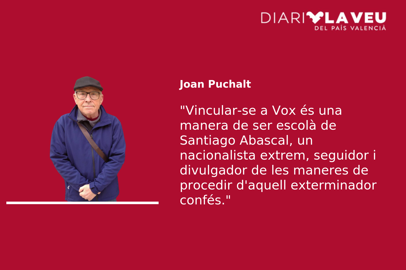 Vincular-se a Vox és una manera de ser escolà del seu líder Santiago Abascal, un nacionalista extrem, seguidor i divulgador de les maneres de procedir d’aquell exterminador confés, mitjançant l’afusellament constant de tot aquell que no pensava com el jagut al cementeri de Mingorrubio, tot després d’haver contaminat el sòl de les nombroses víctimes, els familiars de les quals no volien ni oldre’l quan jeia al Valle de los Caídos.