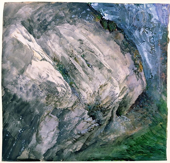 A mitjan segle XIX, la descripció exhaustiva del paisatgisme prerafaelita implicava un esforç físic important per als artistes que eixien dels seus tallers a fi de captar de manera directa el que la naturalesa els oferia: havien de carrejar, a peu, tots els estris necessaris per camins difícils, o camp a través, provant de trobar el motiu adequat; havien de pintar amb els inconvenients propis dels espais oberts i, a més, condicionats pels canvis atmosfèrics i lumínics que es produïen de continu, i havien de tornar al lloc triat cada jornada fins a acabar l’obra o quedar-se allà mateix i patir les incomoditats que això suposava. En aquesta època, Ruskin pinta seguint els postulats de la Germandat i acosta la mirada a aquells aspectes que, en la mesura que presenten entitat suficient als seus ulls, pretén plasmar sobre el full. «Una roca és una muntanya en miniatura», afirma a Modern Painters (1856).