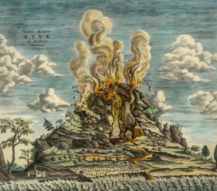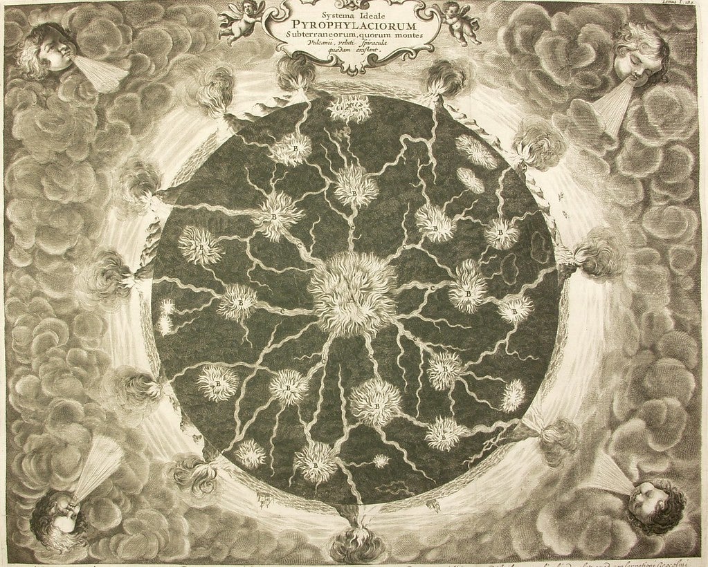 Només cal tenir en compte —apunta Sontag— que, en el segle anterior, els exhaustius exàmens duts a terme pel gran predecessor del Cavaliere, Athanasius Kircher (1602-1680), de l’Etna i el Vesuvi, als cràters dels quals fins i tot va baixar mitjançant una politja, no van dissuadir un estudiós com ell d’oferir una descripció totalment imaginària de les entranyes d’aquests colossos. «Les imatges que il·lustren el seu Mundus subterraneus mostren el Vesuvi, en un tall transversal, com una closca buida que conté un altre món amb cel, arbres, muntanyes, valls, cavernes, rius, tant d’aigua com de foc.» No ha d’estranyar-nos, ja que l’obra del jesuïta alemany, representant destacat de l’erudició barroca, prototip del savi que dominava tots els camps del saber, professor de matemàtiques, física i llengües orientals al Collegium Romanum de la capital italiana, investigador d’una gran diversitat de temes, i creador del Museum Kircherianum —on va reunir artefactes, curiositats d’història natural i aparells científics—, tot i haver parat especial atenció a les informacions provinents de l’experiència directa, mai no va entrar en contradicció amb les Sagrades Escriptures. «En suma, les llums de la fe i les reflexions de la raó», afirma Gómez de Liaño. Així, el fet de creure en la veritat de l’Antic Testament el va obligar a ocupar-se de qüestions referents a l’altura de la torre de Babel o la distribució dels animals a l’arca de Noè.