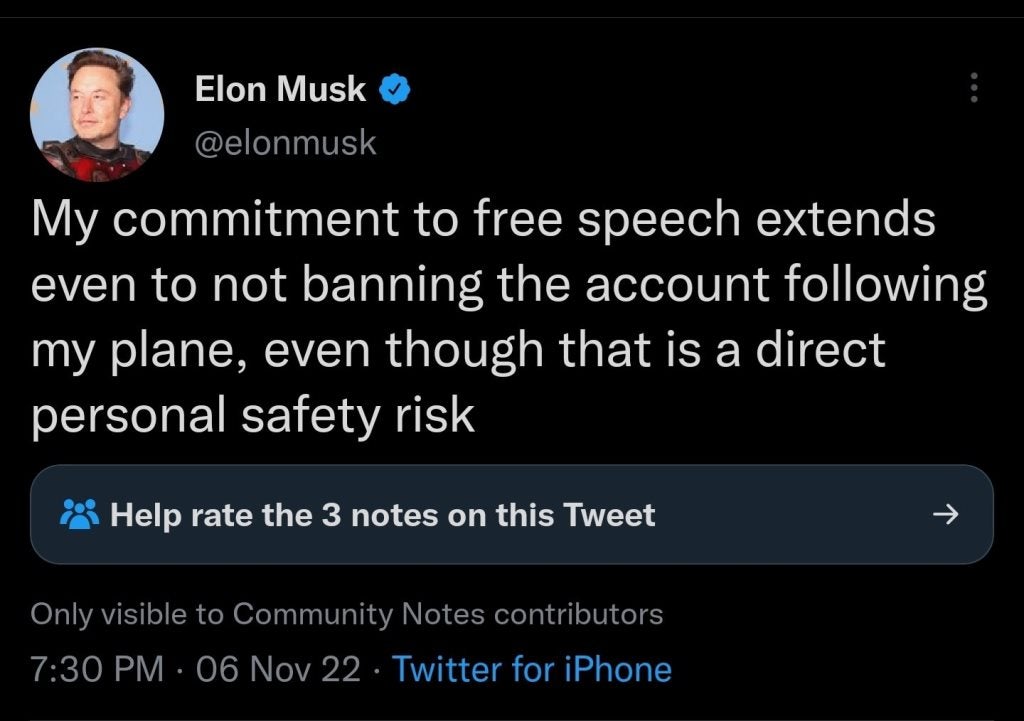 Abans de continuar, obrim un xicotet parèntesi per explicar que el bloqueig dels periodistes va arribar dos dies després que Twitter eliminés el perfil @ElonJet, que publicava informació amb temps real dels vols de l’avió privat de Musk amb exactament els mateixos arguments. Aquesta, però, és una informació pública que qualsevol persona pot aconseguir posant el número de matrícula de l’avió (N628TS) al web que monitoritza en directe tots els vols del món. (En el moment d’escriure aquestes ratlles, Musk estava sobrevolant Califòrnia en direcció a Austin, Texas, per si a algú li interessa). Musk en persona havia promès, fa només un mes i mig, que no suspendrien el compte @ElonJet perquè «el seu compromís amb la llibertat d’expressió era més important que la seguretat personal». I tanquem parèntesi.