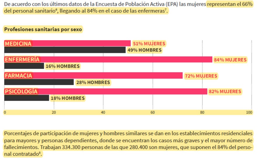 La pandèmia ha amplificat la desigualtat de gènere, cosa que afecta particularment les dones. Segons l’Estudi de Seroprevalença del Ministeri de Sanitat (2020) els col·lectius amb una prevalença més gran que la mitjana nacional (situada al 9,9%) han estat el personal sanitari (16,8%), les dones que treballen en la cura de persones dependents en el domicili (16,3%), les dones que realitzen tasques de neteja (13,9%), i les que treballen en residències de gent gran (13,1%). Aquests sectors estan altament feminitzats, són serveis considerats essencials que han patit una sobrecàrrega de treball considerable durant aquests mesos, la qual cosa les situa entre les de major risc de contagi, sobretot si es té en compte que moltes no comptaven amb els recursos de protecció adients.