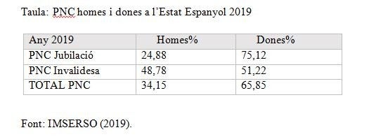 Un altre element més que discrimina i empobreix les dones al llarg de la seua vida és l’arribada de la jubilació donada la bretxa de les pensions existent entre homes i dones, que és de 32,5 punts. En arribar l’edat de jubilació moltes no tenen les cotitzacions necessàries per a tindre una prestació per jubilació pels motius que hem esmentat abans. Per això les dones grans es veuen obligades a sobreviure amb les pensions no contributives que són més baixes (392 euros/mes aproximadament). Entre les persones que perceben pensions no contributives per jubilació el 75% són dones, i entre les que perceben pensions no contributives per invalidesa el 51% són dones segons l’IMSERSO (2019).
