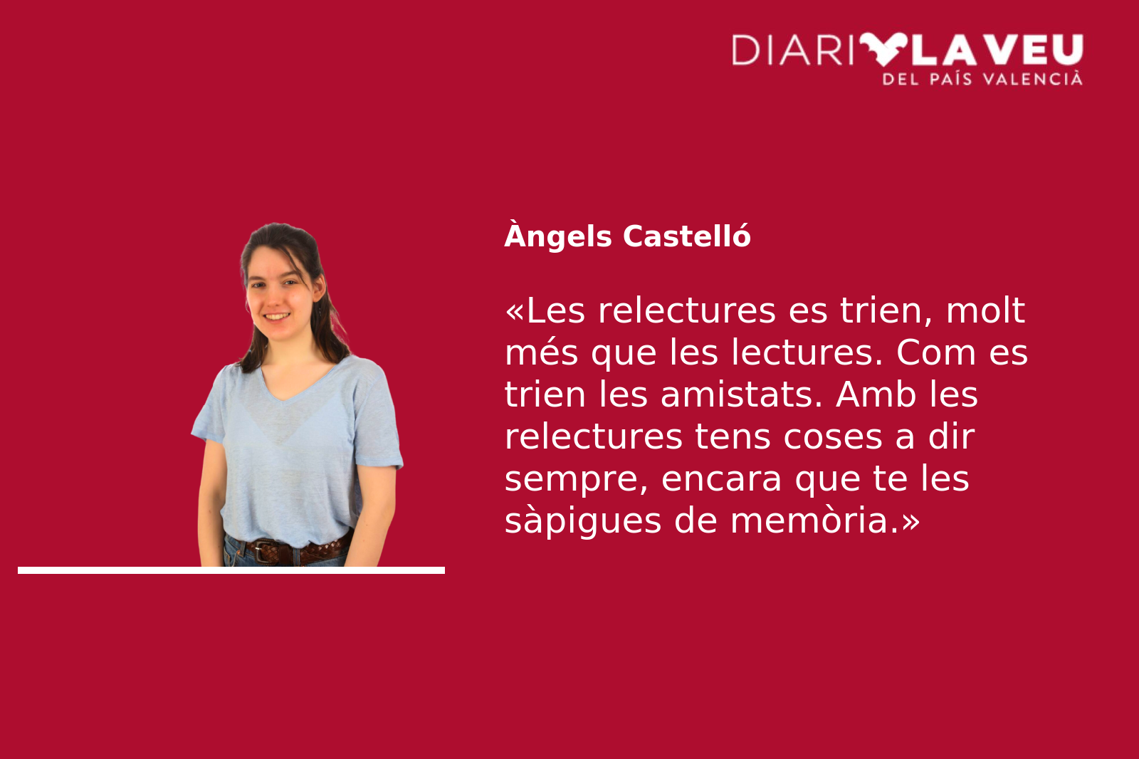Abans de ser lectora, quan ja m’agradava llegir, pensava que la relectura era la forma de lectura més avorrida de totes. Havia sentit l’aforisme de Fuster i deia en veu baixa tothom s’equivoca. Com si en un moment d’esplendor no haguera demanat els mateixos contes tres milions de vegades. Com si ara no parlara d’un mateix llibre en bucle. Com si no m’agradara aprendre’m de memòria passatges per a repetir-los abans de dormir i mentre camine pel carrer. Com les anècdotes que ens uneixen a algú, que cal explicar-les de tant en tant, per si de cas, per reafirmar-nos, per recordar i recordar i recordar.