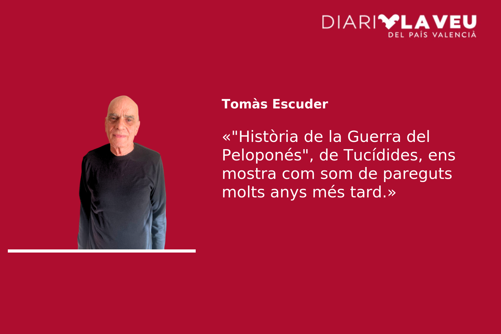 Tucídides és una meravella per a aclarir alguns comportaments. I la seua lectura, especialment la seua Història de la Guerra del Peloponés, és, damunt de tot divertida. Veure com tot aquell enorme univers de ciutats gregues barallant-se o aliant-se, fent pactes o traïdories sense fi, ens mostren com som de pareguts molts anys més tard.